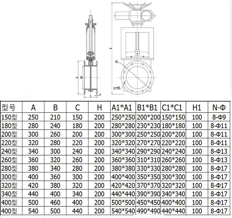 電動插板閥安裝尺寸及參數: